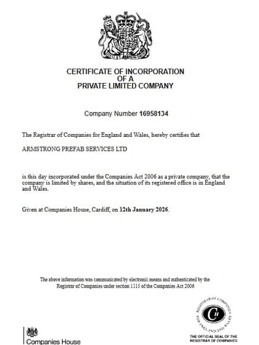 © 2025 Armstrong Prefab Services Ltd & Armstrong Container Service Ltd. All rights reserved. Registered in England & Wales (Company No. 16958134 & 11995092). Trading as Armstrong Prefab Cabins & Containers.